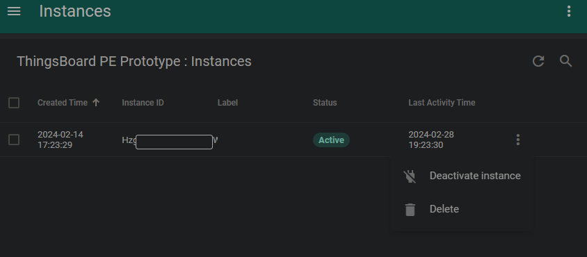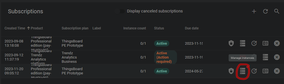 - im License portal https://license.thingsboard.io unter Subscriptions den Subscription Plan finden > 'Manage instances':
