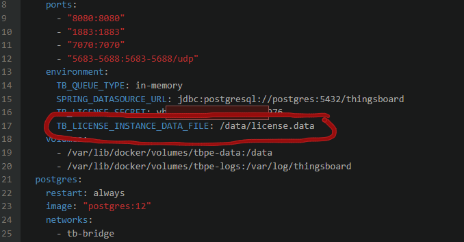 Wenn keine /usr/share/thingsboard/bin/instance-license.data aufzufinden ist, könnte es an folgender Zeile in der docker-compose.yaml liegen: