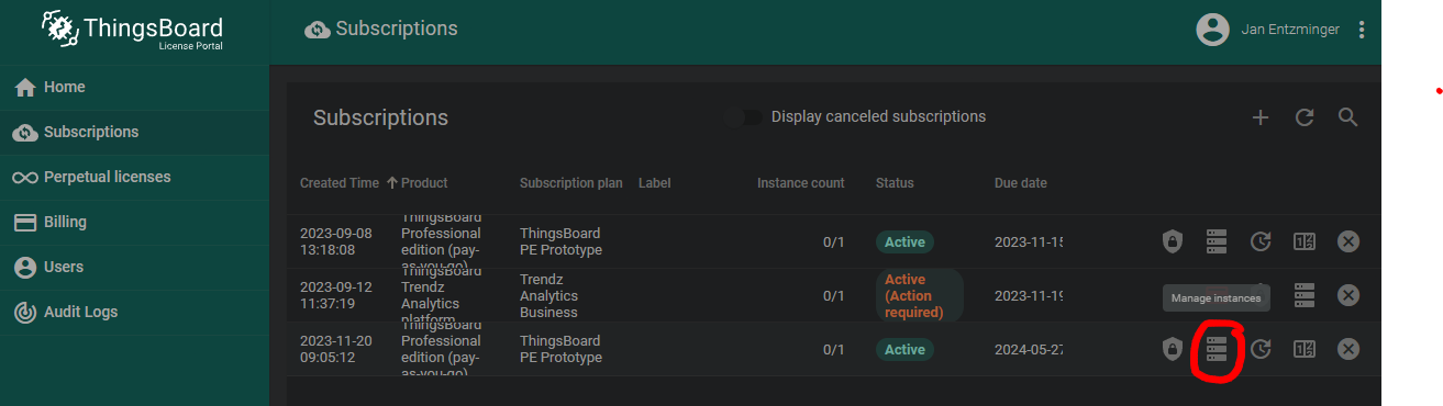 - im License portal https://license.thingsboard.io unter Subscriptions den Subscription Plan finden > 'Manage instances':