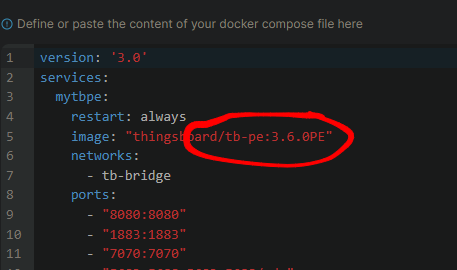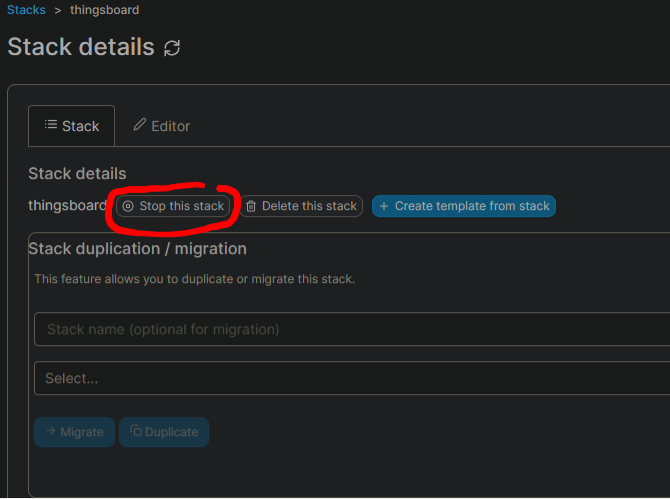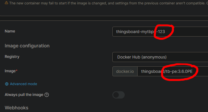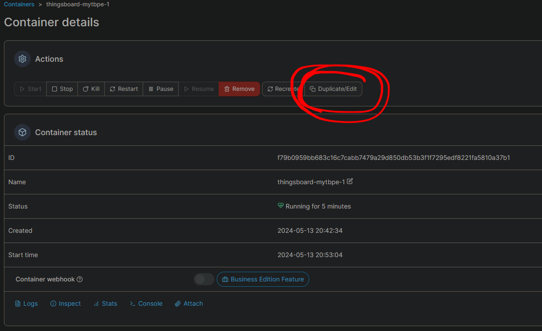 - Auf den existierende Container gehen (zb Stacks>thingsboard>thingsboard-mytbpe-1) und auf 'duplicate/edit':