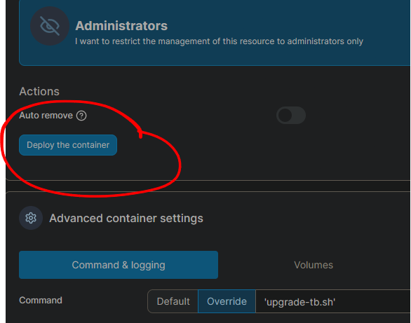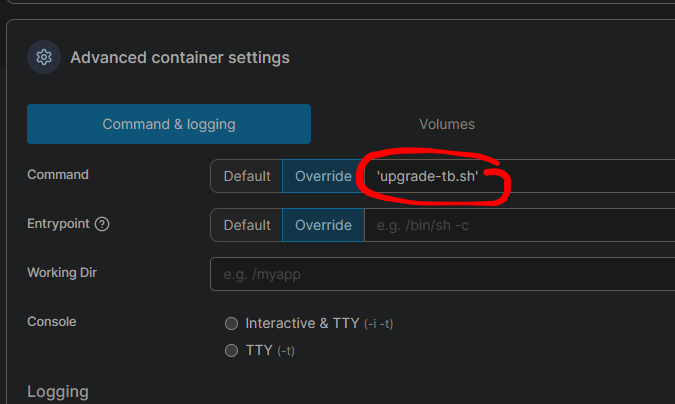 In Portainer hingegen ist das docker run Kommando so an sich nicht möglich. Daher muss der existierende Container dupliziert werden, um dann den CMD Wert des Containers ändern zu können.