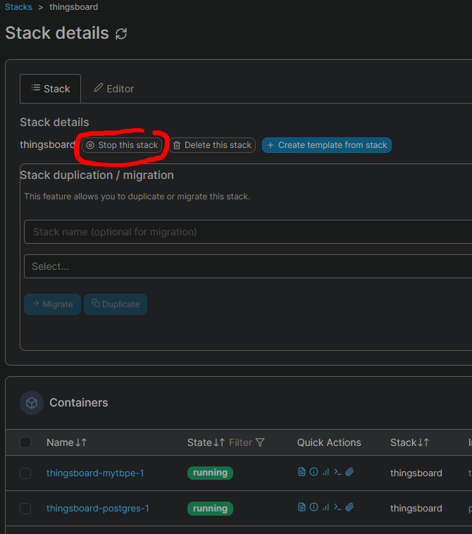 - Auf den existierende Container gehen (zb Stacks>thingsboard>thingsboard-mytbpe-1) und auf 'duplicate/edit':