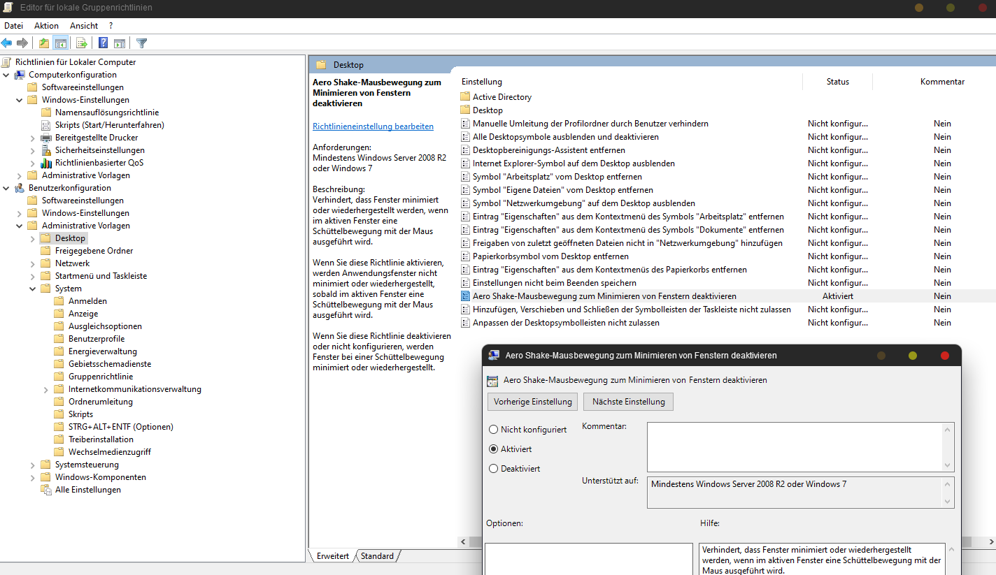Richtlinie "Aero Shake-Mausbewegung zum Minimieren von Fenstern deaktivieren" öffnen und aktivieren