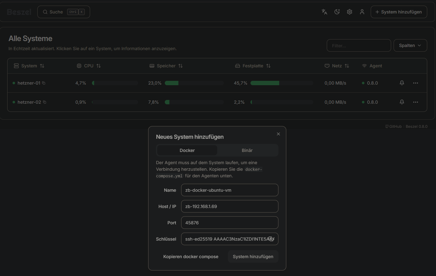 Obacht: Beszel ist nicht für Remote-Server geeignet, sondern nur für IP-Adressen, die übers LAN erreichbar sind. Am besten mit einem Mesh-VPN wie Tailscale oder Netbird lösen