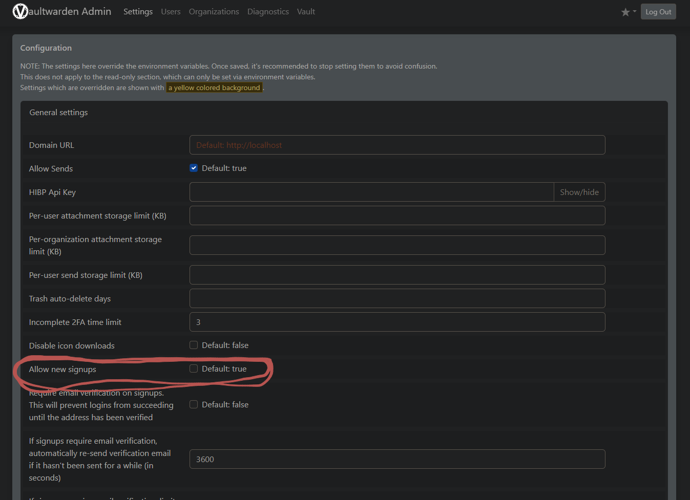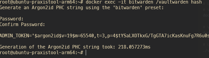 NEU ADMIN_TOKEN mit `vaultwarden hash` erstellen. Das Passwort bei der Tokenerstellung ist gleichzeitig das Passwort für die Adminpage https://bitwarden.meineseite.de/admin