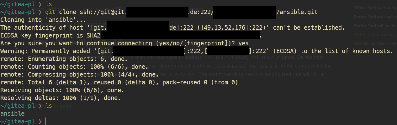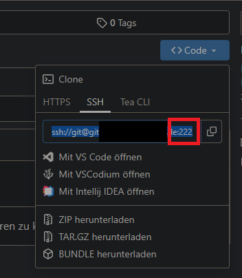 Danach den Gitea-Container neustarten und in einem Repo unter Code > SSH die Adresse checken, ob der Port übernommen wurde: