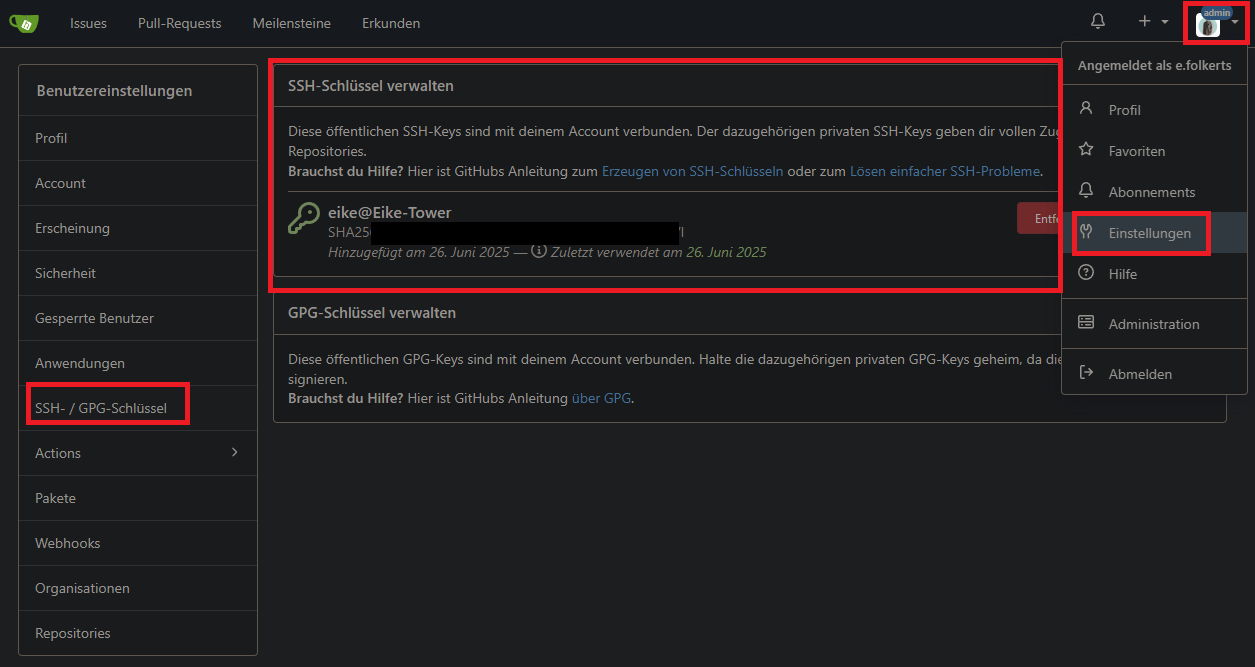 Um den eigenen SSH-Key verwenden zu können, muss der Public-Key natürlich noch in Gitea eingepflegt werden unter