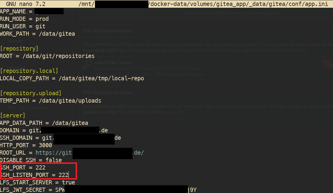 Im meiner docker-compose.yml oben ist port 22 im Container auf Port 222 vom Host gemappt. Daher muss noch im Container in der app.ini der SSH-Port angepasst werden: