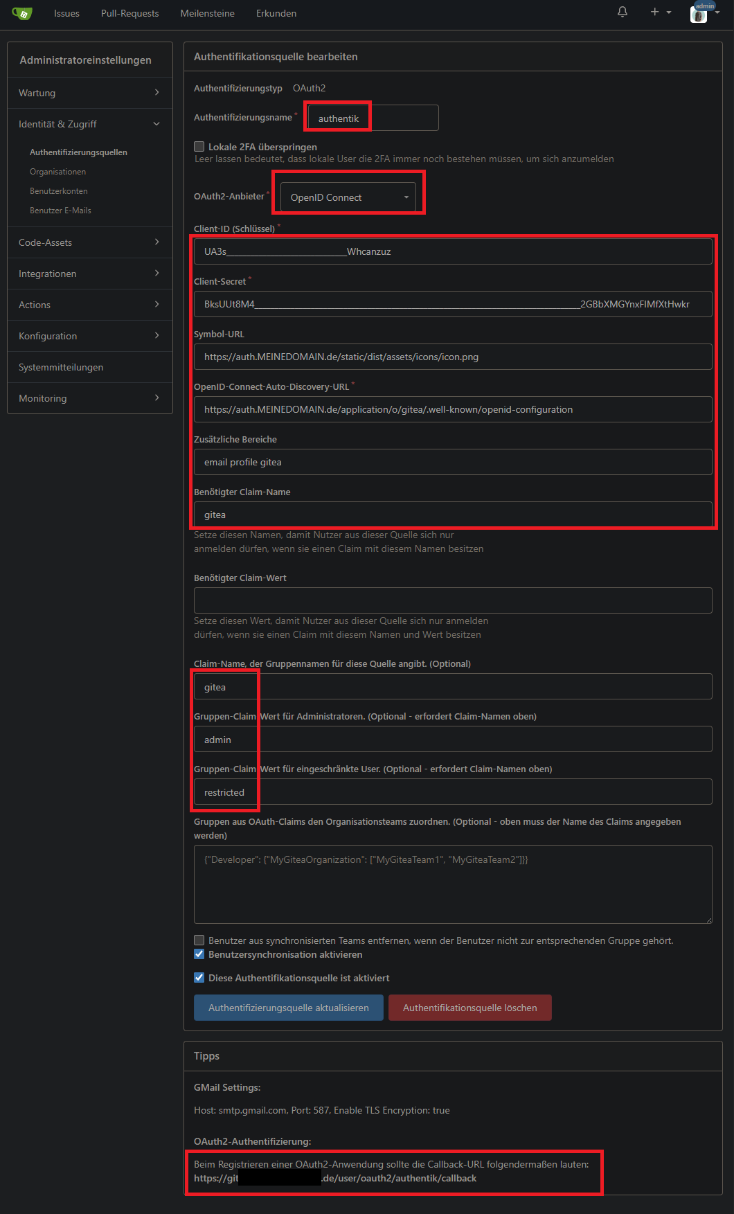 OIDC-Settings in Gitea
