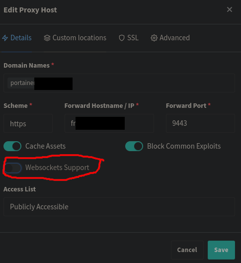 Wenn man in Portainer nicht auf die Konsole eines Containers gelangt, könnte es sein, dass im NGINX Proxy Manager der Haken bei Websockets fehlt:
