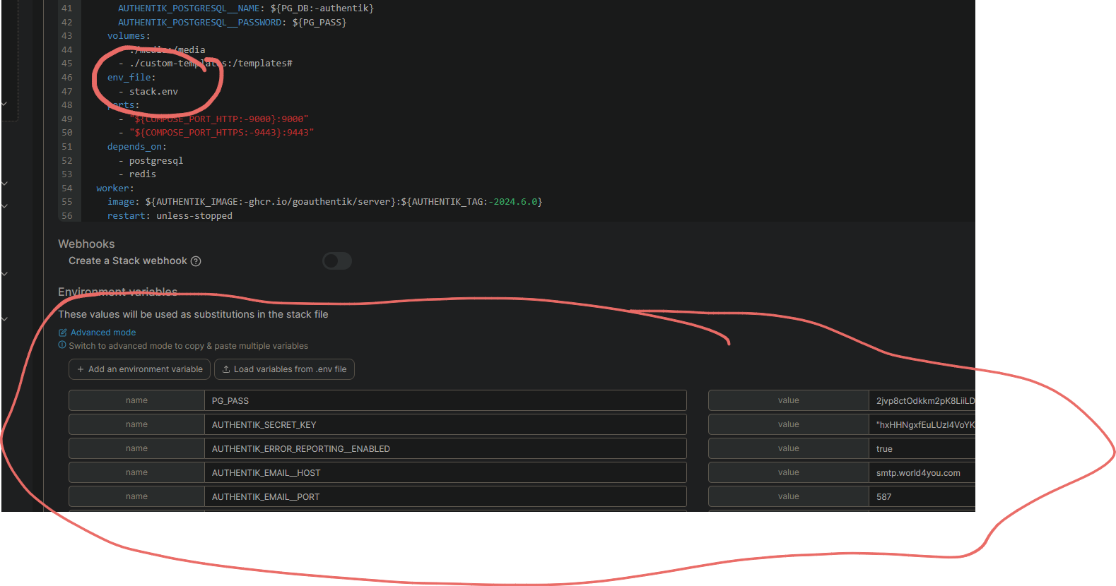 Dabei ist egal, ob die Variablen aus einer .env geladen, im Advanced Mode oder wie auf dem Screenshot im Simple Modus ausgefüllt wurden.