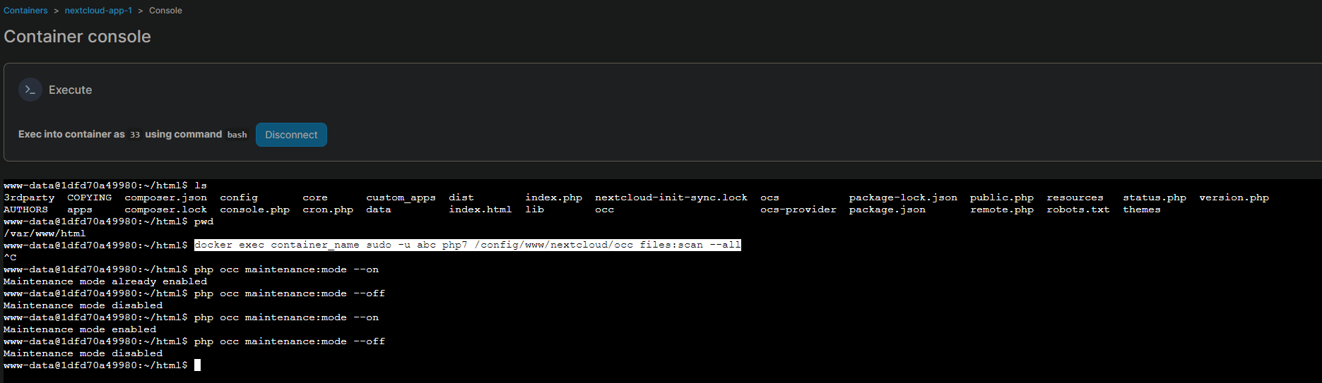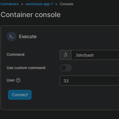 docker exec -it -u 33 nextcloud-app-1 /bin/bash
