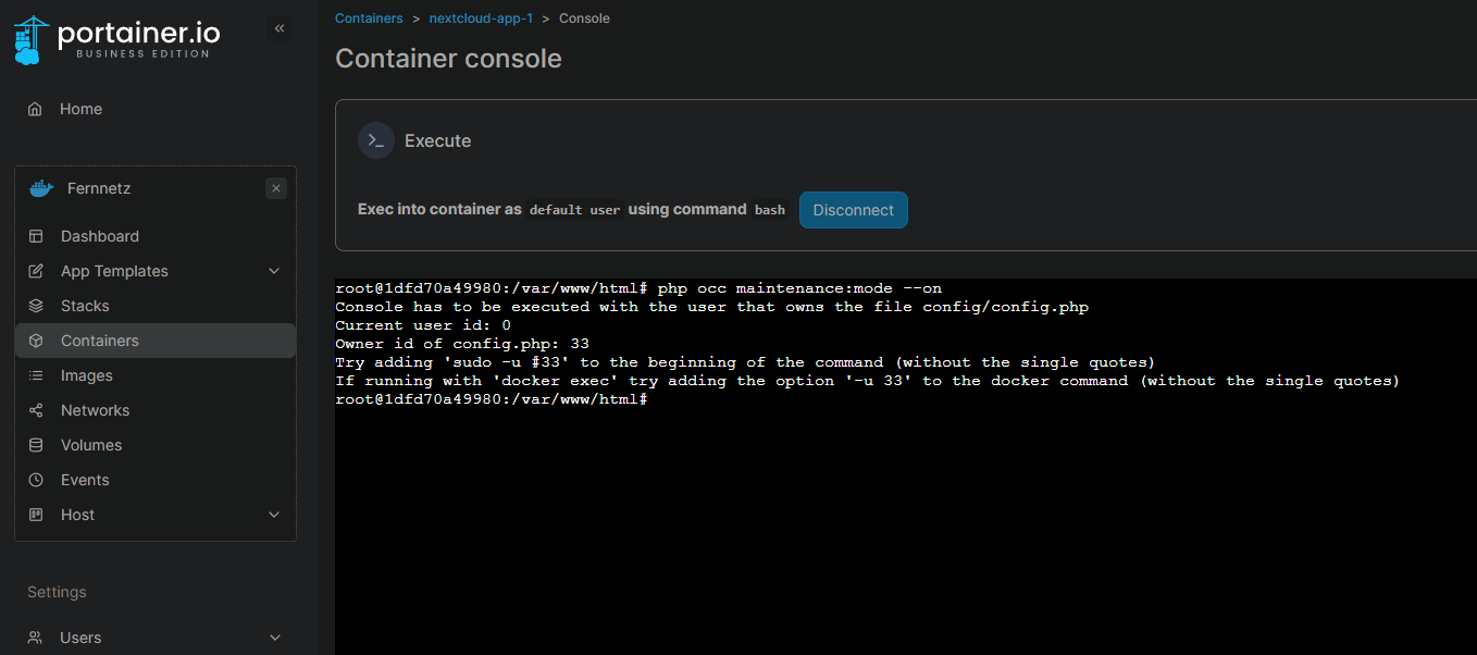 danach die Konsole des Containers nochmal starten, diesmal mit dem vorgeschlagenen Nutzer (user id 33 in meinem Fall, wie in der Ausgabe vorgeschlagen):