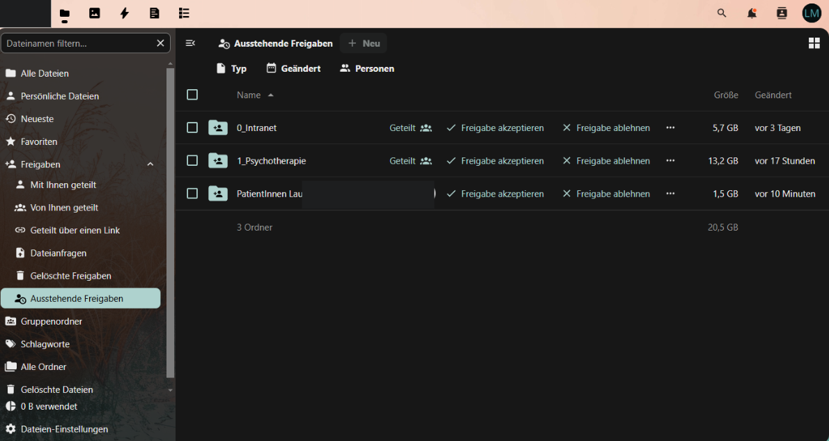 Neu angelegte User müssen zuerst Freigaben im Ordner 'Ausstehende Freigaben' akzeptieren, die mit ihrer Gruppe geteilt sind, bevor die freigegebenen Ordner unter ‘Alle Dateien‘ angezeigt werden.