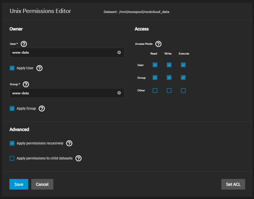 Permissions/Rechte vom Dataset auf www-data ändern (TrueNAS -> Dataset -> Permissions -> Edit):