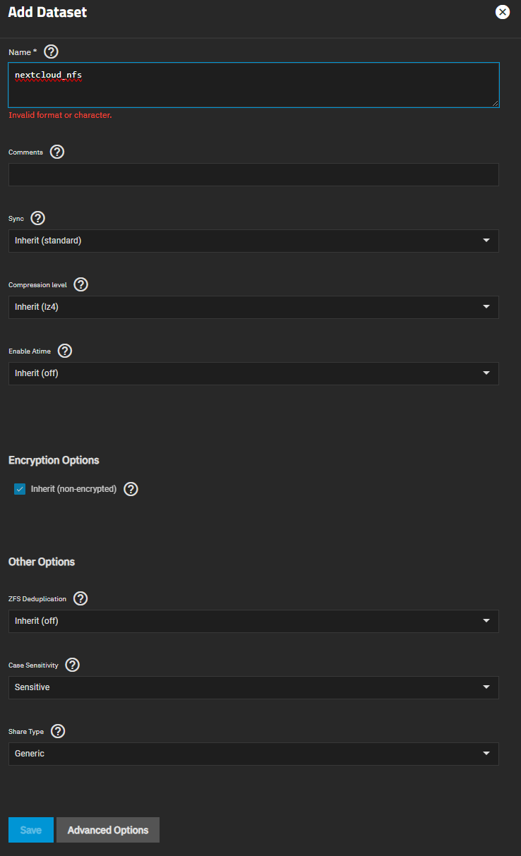 - Dataset erstellen (TrueNAS -> Dataset -> Add Dataset):