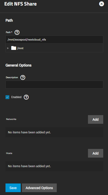 - NFS Share Share für Ordner einstellen und aktivieren (TrueNAS -> Shares -> NFS):