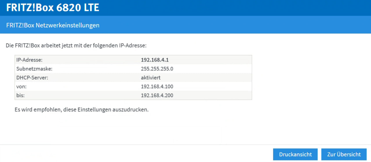 Falls der Router ausgetauscht wird: Das Subnetz beim neuen Router auf 192.168.4.0/24 stellen (Fritzbox bzw. neuer Router erhält dann auch die 192.168.4.1) und DHCP-Bereich zwischen IP 100 und 200 einstellen (siehe Bild oben)